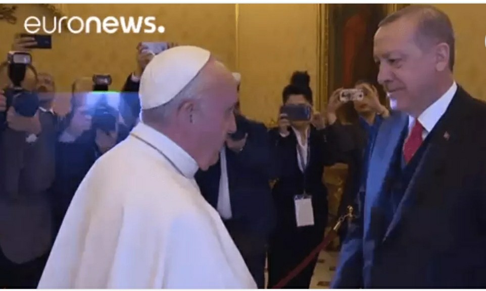 Δεν είναι οξύμωρο για τον κοινό νου αυτή η πρόσκληση; Εμείς θα σας πούμε ότι δεν είναι καθόλου οξύμωρο, γιατί πρέπει να σας γυρίσουμε στο 2018, τότε που ο πάπας Φραγκίσκος δώρισε στον Ερντογάν μετάλλιο με τον “‘Αγγελο της ειρήνης” και του είπε χαρακτηριστικά: “Είναι το σύμβολο ενός κόσμου που βασίζεται στην ειρήνη και στη δικαιοσύνη. Είναι ο άγγελος της ειρήνης που στραγγαλίζει το δαίμονα του πολέμου”. Αυτό έγινε, για να βραβευτεί ο Τούρκος Πρόεδρος για τις θηριωδίες του στο Αφρίν της Συρίας. Από τότε λοιπόν, υπάρχει αυτή η αμοιβαία εκτίμηση και αγάπη. Και φυσικά τέτοιου είδους αγάπη είναι γνωστό ότι οδηγεί σε καταστροφικά αποτελέσματα.