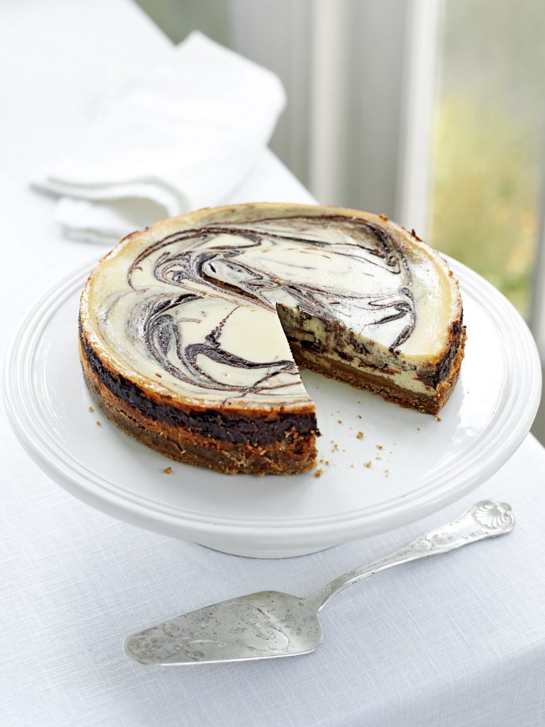 Απλώνουμε το μισό μείγμα τυριού στη βάση του τσίζκεϊκ. Στρώνουμε τη λιωμένη κουβερτούρα και καλύπτουμε με το υπόλοιπο μείγμα τυριού. Με τη μύτη ενός μαχαιριού ή μια οδοντογλυφίδα δημιουργούμε οχτάρια για να αναμειχθούν το τυρί και η σοκολάτα.