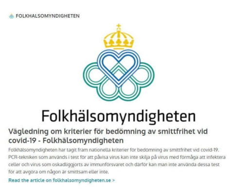 Ο Σουηδικός Οργανισμός Δημόσιας Υγείας έχει αναπτύξει εθνικά κριτήρια για την αξιολόγηση της απουσίας μόλυνσης από COVID-19.