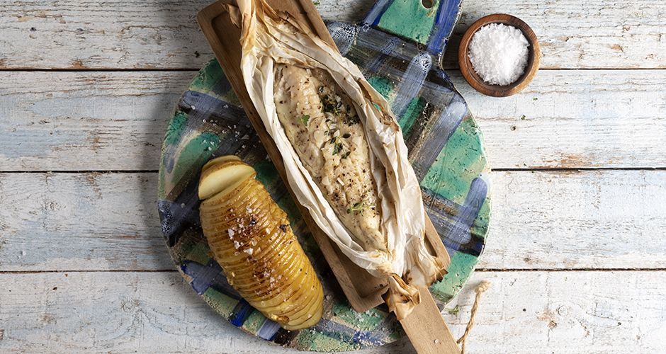 Φιλέτο μπακαλιάρου παπιγιότ με πατάτες ψητές