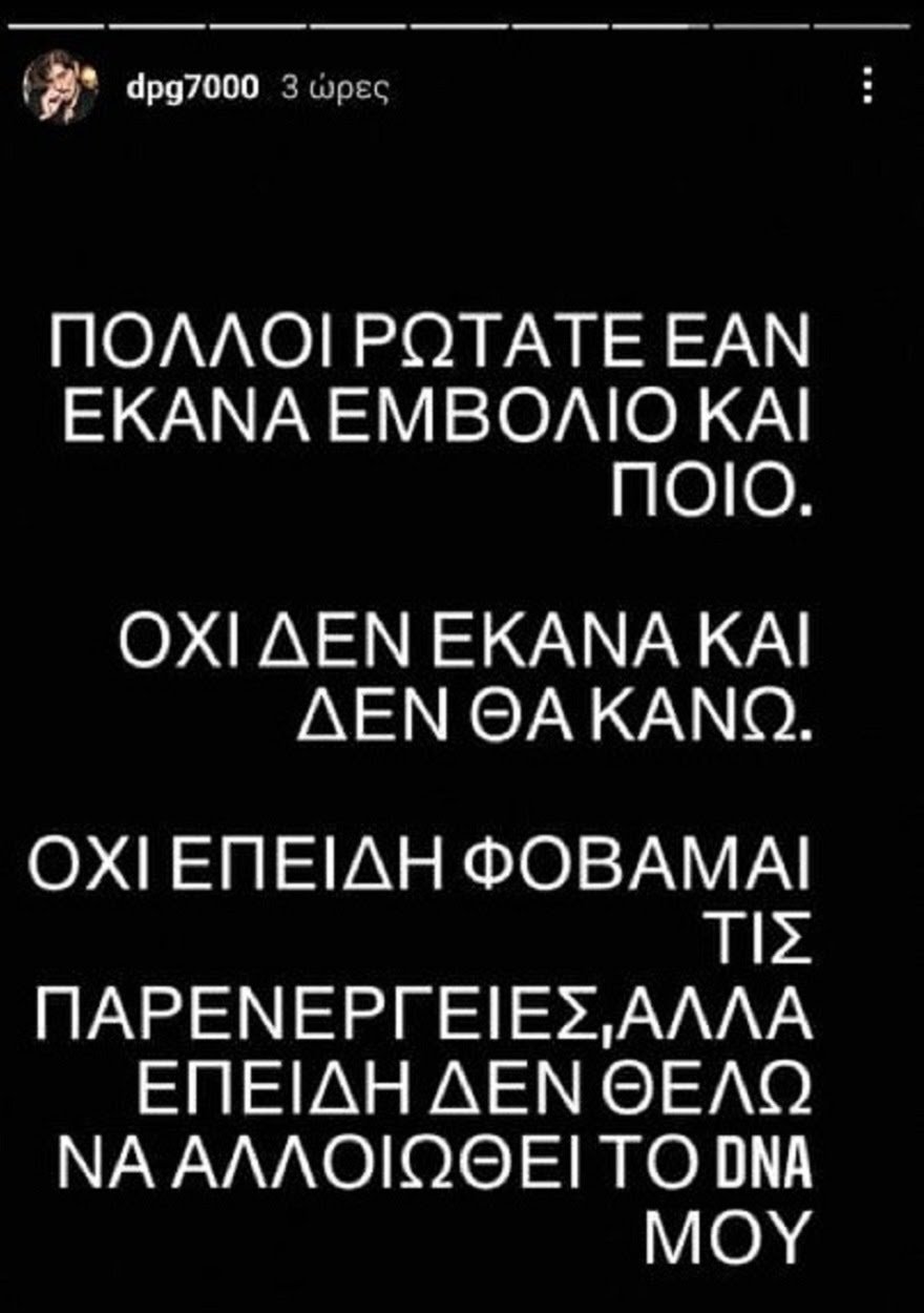 "Πολλοί ρωτάτε εάν έκανα το εμβόλιο και ποιο. Όχι δεν έκανα και δεν θα κάνω. Όχι επειδή φοβάμαι αλλά επειδή δεν θέλω να αλλοιωθεί το DNA μου".