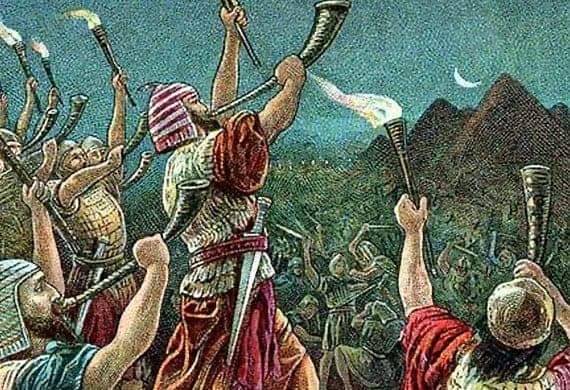Λίγο πριν από τα μεσάνυχτα, μόλις είχε γίνει αλλαγή φρουράς στο στρατόπεδο των εχθρών, ο Γεδεών με το τμήμα που είχε μαζί του μπήκαν στην αρχή του στρατοπέδου και σε μια στιγμή εσάλπισαν με τις σάλπιγγες και συγχρόνως πέταξαν με δύναμι κάτω και έσπασαν τις στάμνες που κρατούσαν. Το σύνθημα δόθηκε. Οι άλλες δύο ομάδες έκαναν το ίδιο· και όλοι μαζί τώρα, κρατώντας με το αριστερό χέρι τους αναμμένους πυρσούς και με το δεξιό τις σάλπιγγες, εσάλπιζαν δυνατά και φώναζαν: «Ρομφαία τω Κυρίω και τω Γεδεών» (Κριτ. ζ’ 20). Το σπαθί είναι στα χέρια του Κυρίου και του Γεδεών.