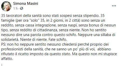 Στην υγειονομική χούντα του Μεγαλοτραπεζίτη Ντράγκι στη γειτονική Ιταλία αναζητούνται εξιλαστήρια θύματα και στοχοποιούνται επαγγελματίες που δεν θυσιάζουν την πολιτική όσο και και την ιατρική συνείδησή τους που δεν υποκύπτουν σε καταναγκαστικά έργα εμβολιασμού επειδή αρνήθηκαν να υποβληθούν στον αμφιλεγόμενο εμβολιασμό που ως τέτοιος είναι και πειραματικός……”35 εργαζόμενοι στον τομέα της υγείας τέθηκαν σε αναστολή χωρίς αμοιβή.