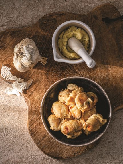 Μύδια σε κουρκούτι με σκορδαλιά