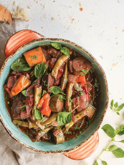 Σβήνετε με το κρασί και σιγοβράζετε για ακόμη 30 λεπτά μέχρι να μελώσουν τα λαχανικά και να μείνει το φαγητό μόνο με το λάδι του.