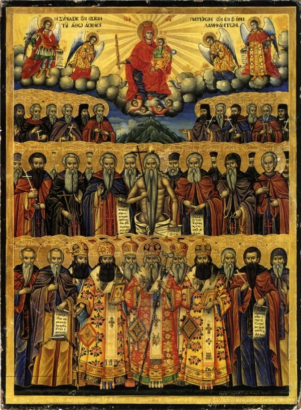 Οι άγιοι του Αγίου Όρους είναι οι φιλόστοργοι πατέρες των Αγιορειτών. Η αγάπη μας προς αυτούς προέρχεται από χρέος και ευγνωμοσύνη για τις δωρεές τους. Είναι αγάπη τέκνων προς κηδεμόνες, μαθητών προς διδασκάλους. Αυτοί μετέβαλαν την αγριότητα του Όρους σε ημερότητα, τον ακατοίκητο τόπο τον έκαναν κατοικήσιμο, την έρημο τη μετέτρεψαν σε πολιτεία. Έγιναν κτήτορες μονών και σύναξαν πλησίον τους πλήθη μοναχών. Όσο ζούσαν ήταν σύμβουλοι και μετά την τελευτή τους έγιναν πρεσβευτές για όλους. Μοναχοί από διαφόρους τόπους συγκεντρώθηκαν σ’ ένα τόπο και πήραν ένα όνομα. Ακόλουθοι του πρώτου ησυχαστή Πέτρου, που του είπε η Θεοτόκος τη χαροποιό επαγγελία, περί συνεχούς προστασίας του Όρους. Και έγινε πράγματι η Θεοτόκος μόνιμη σκέπη, φρουρός και ιατρός όχι μόνο των άγιων, αλλά και όλων των μοναχών.