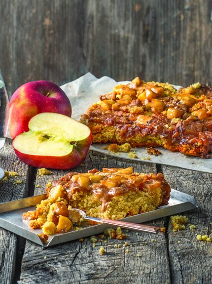 Αδειάζουμε το μείγμα στο ταψί με τα μήλα και ισιώνουμε την επιφάνεια με ένα κουτάλι. Ψήνουμε τη μηλόπιτα για 40-45 λεπτά. Βγάζουμε τη μηλόπιτα από τον φούρνο και αφήνουμε να σταθεί για 10 λεπτά. Την αναποδογυρίζουμε σε μια πιατέλα, την κόβουμε σε κομμάτια και σερβίρουμε αμέσως.