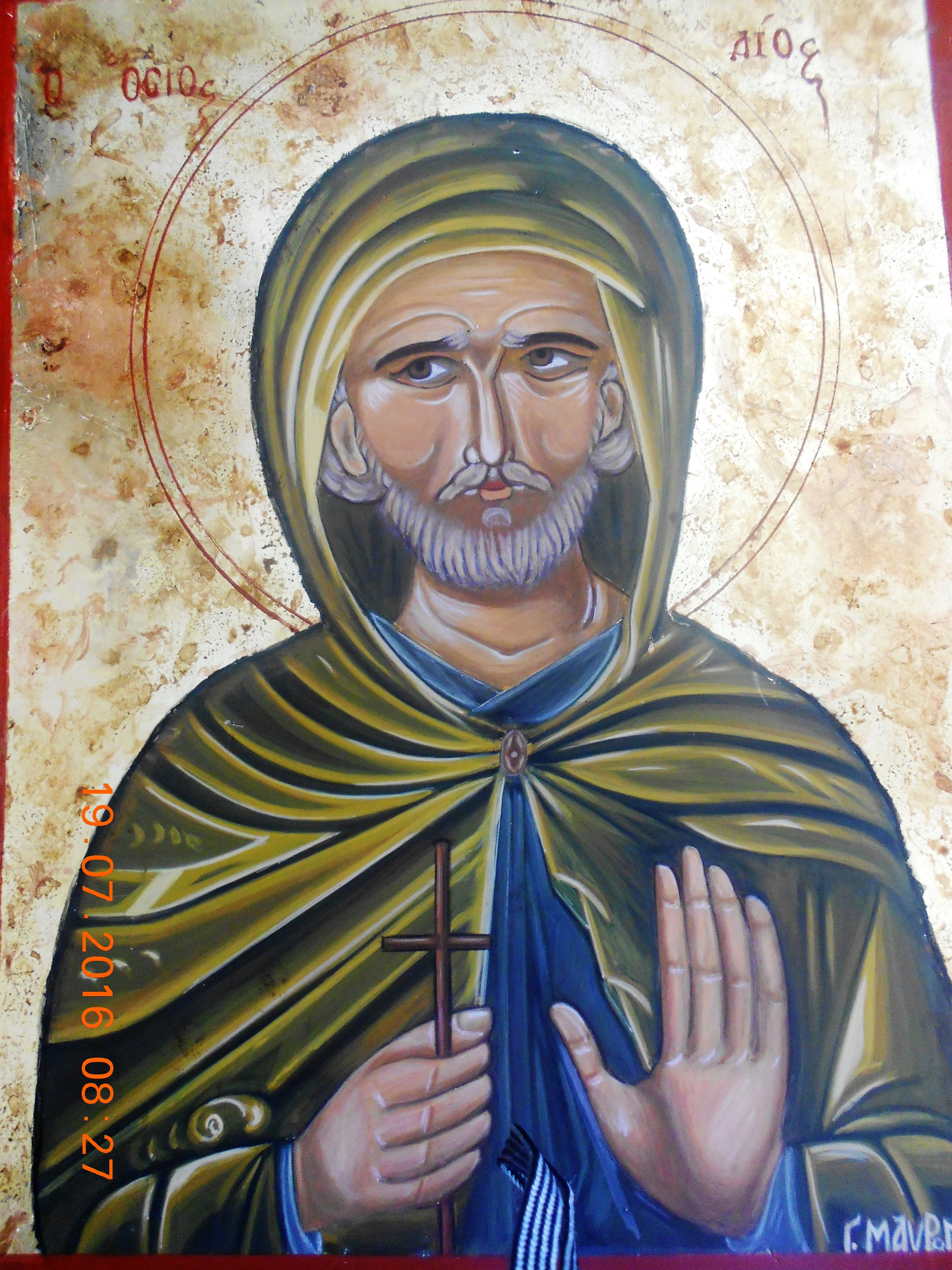 Ἁγνείᾳ ψυχῆς, ἐνθέως ὁπλισάμενος, καὶ ἄπαυστον εὐχήν, ὡς λόγχην χειρισάμενος, κραταιῶς διέκοψας, τῶν δαιμόνων Δίε τὰς φάλαγγας, θαυματουργὲ Πατὴρ ἡμῶν, πρεσβεύων ἀπαύστως ὑπὲρ πάντων ἡμῶν.