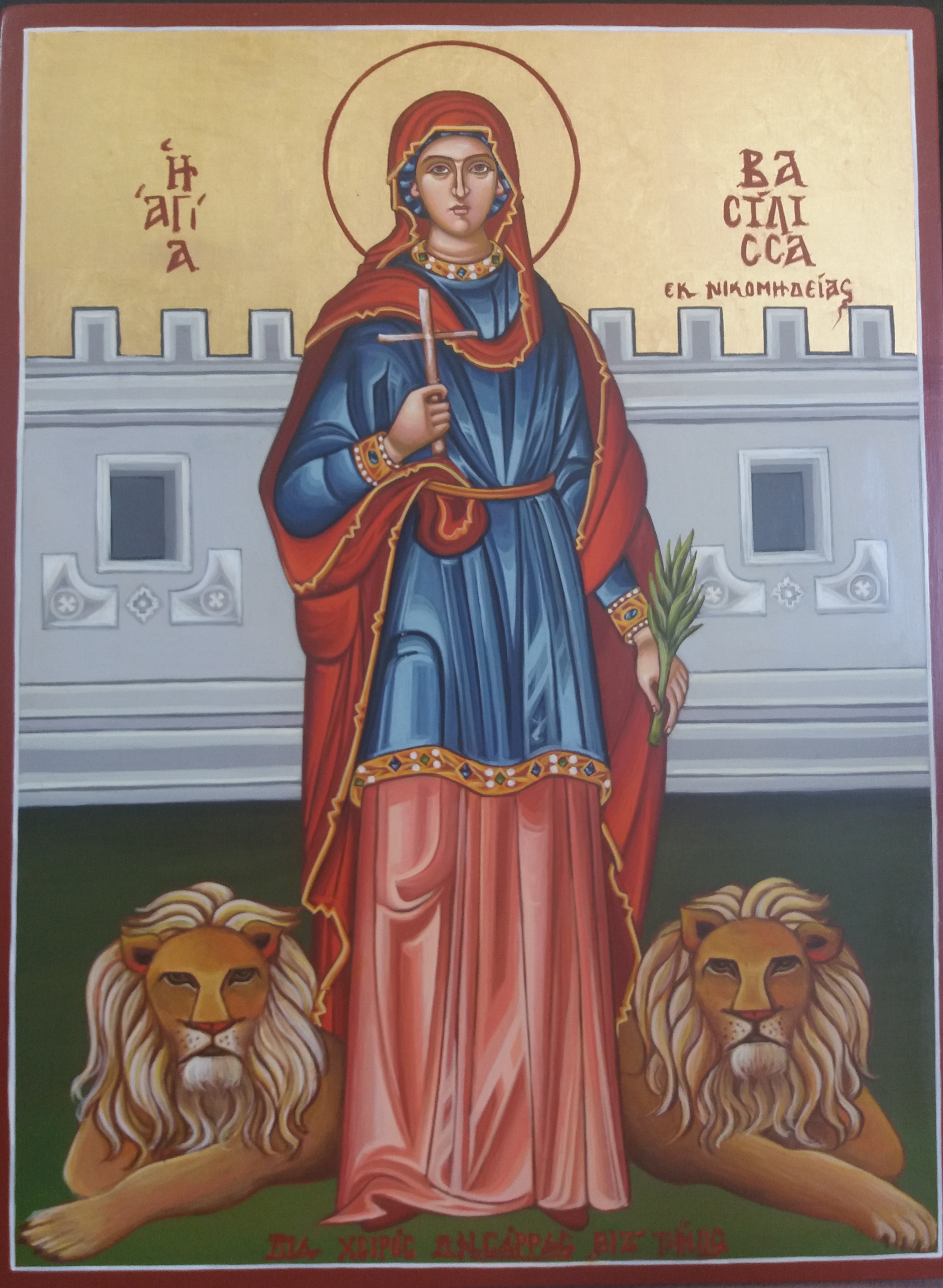 Η Αγία Βασίλισσα υπήρξε το καύχημα της Εκκλησίας της Νικομήδειας, κατά τον διωγμό των Χριστιανών επί Διοκλητιανού. Καταγγέλθηκε σαν χριστιανή, που αποσπούσε νεαρές ειδωλολάτρισσες από την πολυθεΐα και οδηγήθηκε μπροστά στον ηγεμόνα Αλέξανδρο. Εκεί η Βασίλισσα ομολόγησε χωρίς κανένα δισταγμό, ότι είναι χριστιανή και λατρεύει τον Ένα και αληθινό Θεό. Μαστιγώθηκε σκληρά και στη συνέχεια ο ηγεμόνας διέταξε και την έριξαν μέσα στη φωτιά. Αλλά με θαυματουργικό τρόπο η Βασίλισσα, βγήκε από τη φωτιά άθικτη. Οι ειδωλολάτρες, θεώρησαν πως αυτό ήταν μαγική ενέργεια και έτσι την έριξαν για τροφή σε δύο πεινασμένα λιοντάρια. Η Βασίλισσα όμως, δια της προσευχής προς τον Θεό, έκανε τα δύο λιοντάρια να σταθούν σαν ήμερα αρνιά μπροστά της. Τότε έγινε και το μεγαλύτερο θαύμα. Άνοιξαν τα πνευματικά μάτια του ηγεμόνα Αλεξάνδρου και έπεσε μετανοημένος στα πόδια της Βασίλισσας και ζήτησε απ' αυτή να τον κατηχήσει στη χριστιανική πίστη. Η Βασίλισσα, χαρά γεμάτη, τον παρέπεμψε στον επίσκοπο Νικομήδειας Αντώνιο, ο όποιος κατήχησε και βάπτισε τον Αλέξανδρο Χριστιανό. Ευτυχισμένος πλέον ο Αλέξανδρος, ζήτησε δια της προσευχής από τον Θεό να τον πάρει όσο γίνεται σύντομα κοντά Του, και η δέηση του εισακούστηκε. Μετά από λίγο καιρό, ο Κύριος δέχτηκε και την ψυχή της Βασίλισσας. Το δε τίμιο λείψανο της, τάφηκε από τον επίσκοπο Αντώνιο, κοντά σε μία πέτρα, από την οποία άλλοτε, μετά από προσευχή της, είχε αναβλύσει νερό.
