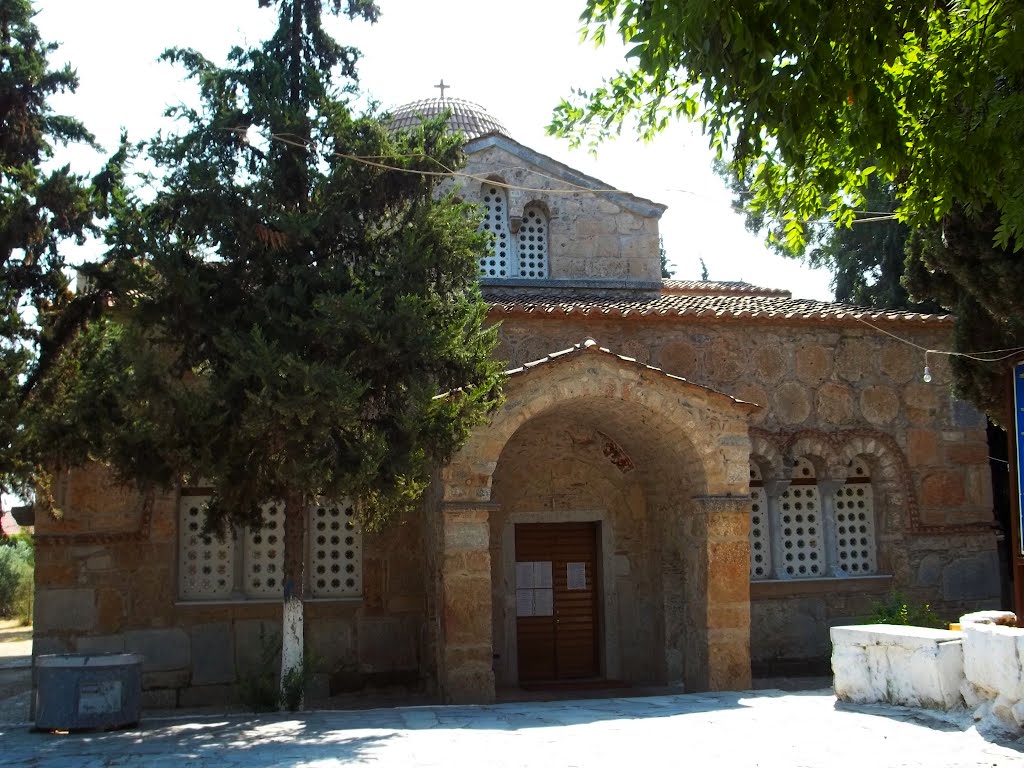 Το μνημείο αυτό είναι προσπάθεια μετάβασης από την παλαιοχριστιανική Βασιλική (Αρχιτεκτονική) στον Βυζαντινό ρυθμό. Ο ναός διασώζει θαυμάσια παλαιοχριστιανικά γλυπτά, σπάνιες επιγραφές της χριστιανικής, αλλά και της προχριστιανικής περιόδου, που χρησιμοποιήθηκαν ως οικοδομικό υλικό. Πιθανότατα ο ναός να σχεδιάστηκε ως ταφικό μνημείο του χορηγού του (μολονότι αυτό δεν συνηθιζόταν στη Βυζαντινή Ελλάδα) και ίσως το κατακόρυφο ηλιακό ρολόι που κοσμεί τον ναό να είναι ένα είδος αναφοράς στην αιώνια ζωή. Ούτως ή άλλως ο κτήτορας του ναού θέλησε το κτίσμα αυτό να έχει: «τερπνόν αποστίλβον περικαλλέα πάντοθεν αίγλην». Ο γλυπτικός διάκοσμος του καθολικού της Μονής είναι πλούσιος στις εσωτερικές και εξωτερικές του επιφάνειες, πολλά γλυπτά μέλη όμως (από αρχαίους ναούς ή και από πρωτοχριστιανικό νεκροταφείο) είναι ενσωματωμένα και στα μεταγενέστερα κελιά, νότια του καθολικού και στο πρόπυλο δυτικά, ενώ άλλα βρίσκονται στις αποθήκες. Τα παλαιότερα κελιά της Μονής βρίσκονται δυτικά από τα νεότερα, σε ένα κτίριο που αποτελείται από πέντε διαδοχικούς κεραμοσκεπείς χώρους.