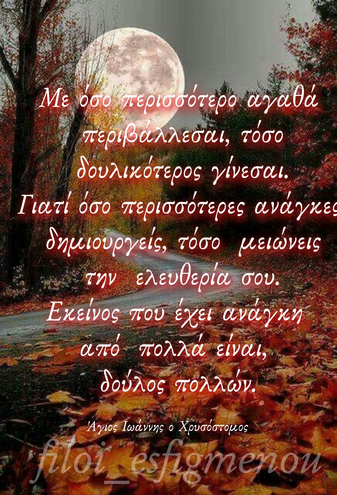 Παλαιότερα στενοχωριόμουν πολύ στην έλλειψη υλικών αγαθών γιατί ήμουν υλίστρια, φιλάργυρη, φιλήδονη, γαστρίμαργη, τώρα όμως έχω αρχίσει να ρεμβάζω προς τον ουρανό και να μην κοιτάω τόσο πολύ στη γη! Νιώθω πιο ευάρεστα με την πνευματικότητα που καλλιεργείται σιγά σιγά μέσα μου! Ναι! Έχει γίνει μια ανατροπή… όχι τα πάνω κάτω αλλά τα κάτω πάνω!