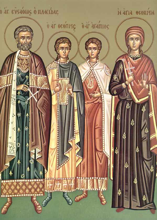 Άγιοι που εορτάζουν: Αγιος Ευσταθιος (; - 117) , Αγια Θεοπιστη η Συζυγος Του Αγιου Ευσταθιου (; - 117) , Αγιος Αγαπιος Το Τεκνο Του Αγιου Ευσταθιου (; - 117) , Αγιος Θεοπιστος Το Τεκνο Του Αγιου Ευσταθιου (; - 117)