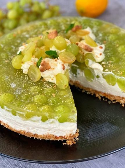 Αδειάζουμε την κρέμα πάνω από το μπισκότο και τη στρώνουμε ομοιόμορφα. Έπειτα, τοποθετούμε τα σταφύλια περιμετρικά- όρθια και όχι πλαγιαστά- μέχρι να καλύψουμε όλη την επιφάνεια της κρέμας. Τέλος, με ένα κουτάλι προσθέτουμε από πάνω από τα σταφύλια το υγρό τζελ μέχρι να τα υπερκαλύψουμε μισό εκατοστό. Τοποθετούμε μια μεμβράνη από πάνω και μεταφέρουμε στο ψυγείο για 2 ώρες μέχρι να σφίξει.