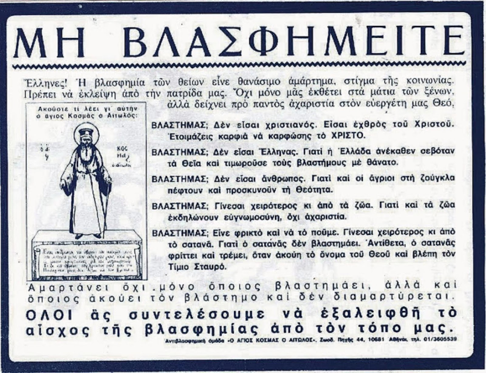 Ὁ βλάσφημος εἶναι ἐπικίνδυνος στὴν κοινωνία, γιατὶ πορώθηκε ἡ καρδιά του, ἡ δὲ πορωμένη καρδιὰ ἔχασε τὴν εὐαισθησία τῆς συνειδήσεως, αὐτὸς δὲ ποὺ ἔχασε αὐτὴ τὴν εὐαισθησία εἶναι ἱκανὸς νὰ πράξει κάθε κακούργημα.