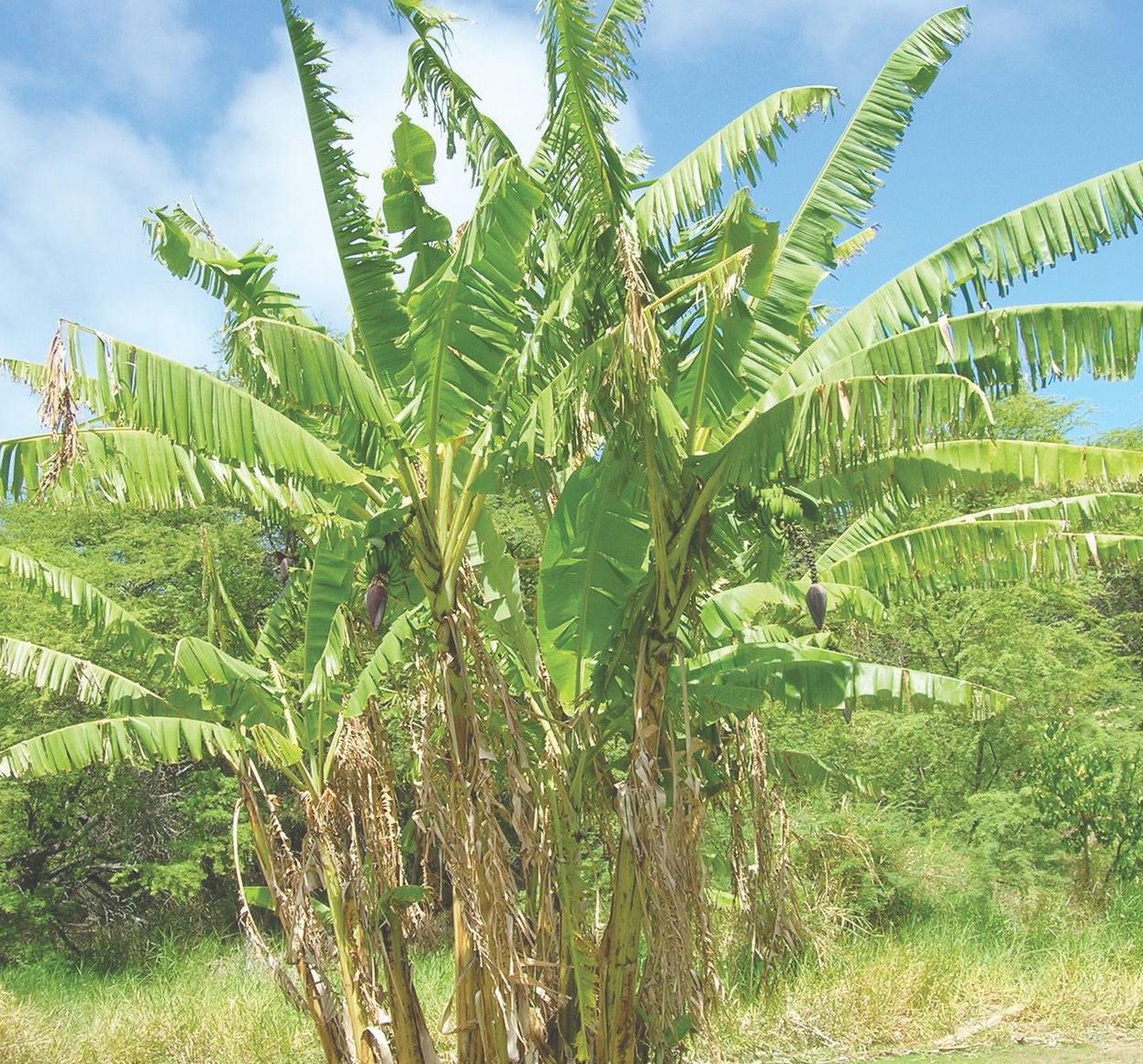 Το φυτό της μπανάνας είναι ψευδόστεμα που αναπτύσσεται έως τα 6 με 7 μέτρα ύψος. Τα φύλλα του φυτού είναι μεγάλα, εύκαμπτα και αδιάβροχα. Είναι διευθετημένα σπειροειδώς και είναι δυνατόν να φτάσουν τα 2,50 με 2,70 μέτρα μήκος και τα 60 εκατοστά πλάτος Χρησιμοποιούνται με πολλούς τρόπους, σαν ομπρέλες και για το τύλιγμα της τροφής με σκοπό το μαγείρεμα ή την αποθήκευση.