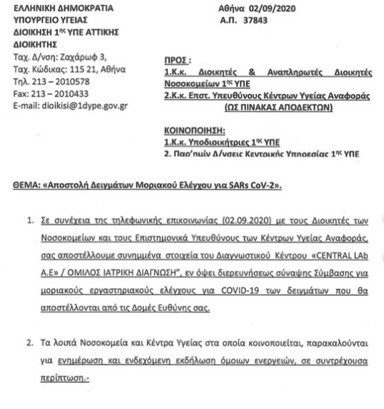 Συγκεκριμένα το έγγραφο αναφέρει ότι «σας αποστέλλουμε συνημμένα στοιχεία του διαγνωστικού κέντρου central lab α.ε /όμιλός ιατρική διάγνωση ενόψει διερευνήσεως σύναψης σύμβασης για μοριακούς εργαστηριακούς ελέγχους για Covid-19 των δειγμάτων που θα αποστέλλονται από τις δομές ευθύνης σας».