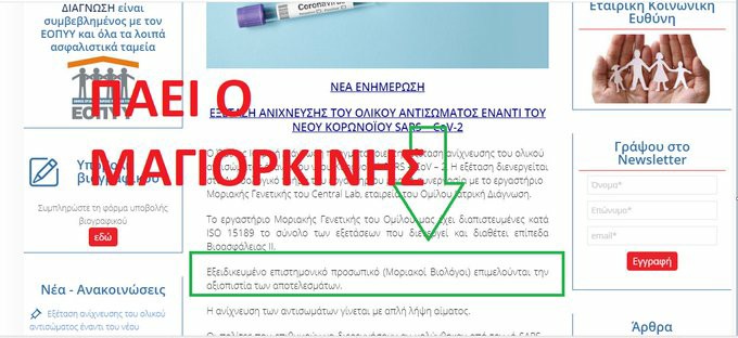 Στην ιστοσελίδα του Ομίλου, σύμφωνα με καταγγελίες, υπήρχε αναφορά στον Γκίκα Μαγιορκίνη, η οποία ήταν αναρτημένη τις προηγούμενες μέρες αλλά μετά «εξαφανίστηκε».Συγκεκριμένα η ιστοσελίδα του Ομίλου τα προηγούμενα 24ώρα ανέφερε ότι «εξειδικευμένο επιστημονικό προσωπικό (μοριακοί βιολόγοι), υπό την επιστημονική υπευθυνότητα του επίκουρου καθηγητή Επιδημιολογίας του ΕΚΠΑ κ. Μαγιορκίνη Γκίκα». Πλέον η ιστοσελίδα αναφέρει «εξειδικευμένο προσωπικό (Μοριακοί βιολόγοι) επιμελούνται την αξιοπιστία των αποτελεσμάτων».