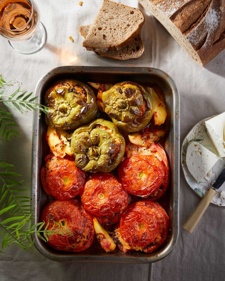 Αλατοπιπερώνουμε το εσωτερικό από τις ντομάτες και τις πιπεριές και τις τακτοποιούμε σε μεγάλο ταψί που να τις χωράει ακριβώς.