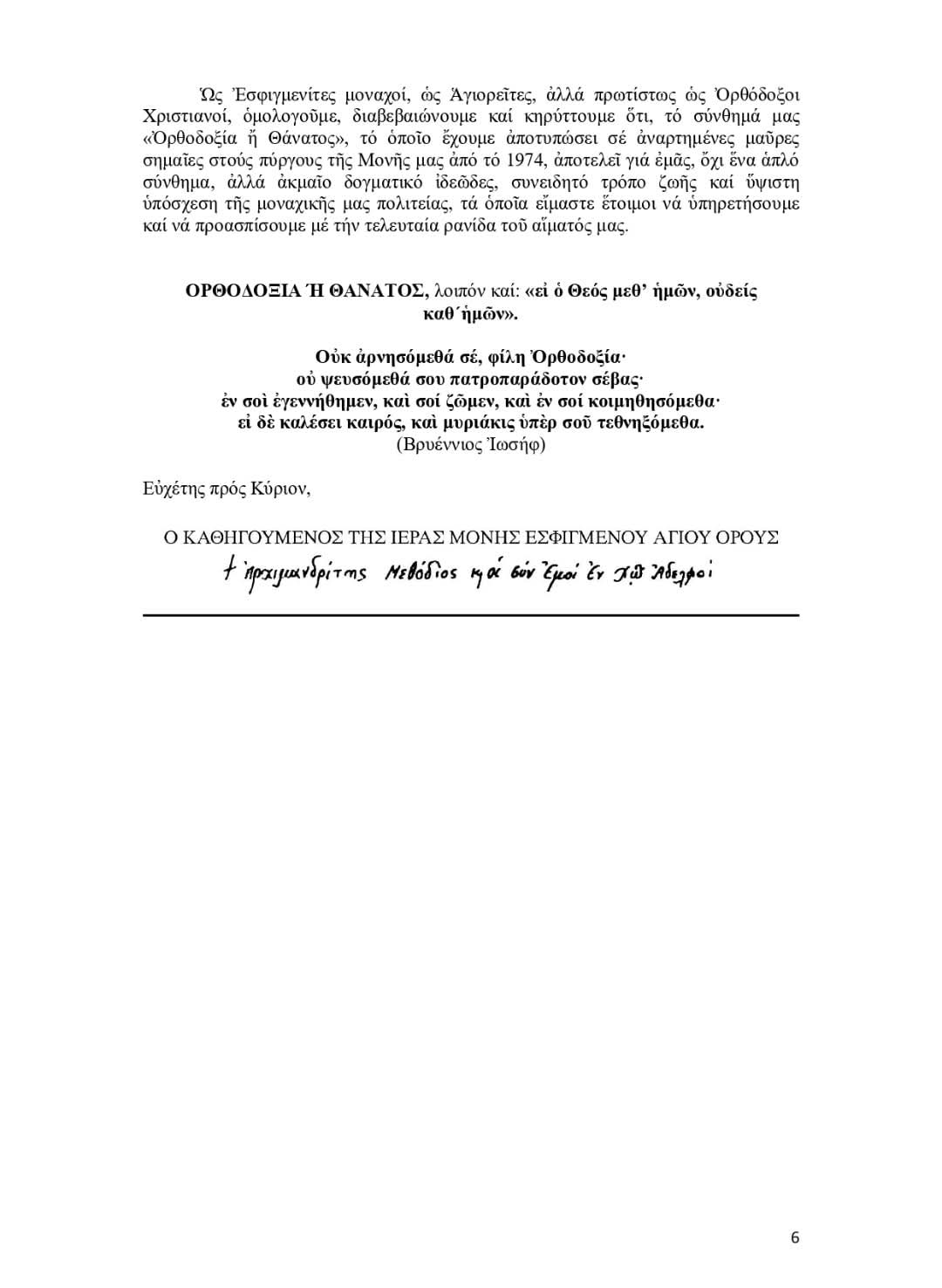 Ὡς Ἐσφιγμενίτες μοναχοί, ὡς Ἁγιορεῖτες, ἀλλά πρωτίστως ὡς Ὀρθόδοξοι Χριστιανοί, ὁμολογοῦμε, διαβεβαιώνουμε καί κηρύττουμε ὅτι, τό σύνθημά μας «Ὀρθοδοξία ἤ Θάνατος», τό ὁποῖο ἔχουμε ἀποτυπώσει σέ ἀναρτημένες μαῦρες σημαῖες στούς πύργους τῆς Μονῆς μας ἀπό τό 1974, ἀποτελεῖ γιά ἐμᾶς, ὄχι ἕνα ἁπλό σύνθημα, ἀλλά ἀκμαῖο δογματικό ἰδεῶδες, συνειδητό τρόπο ζωῆς καί ὕψιστη ὑπόσχεση τῆς μοναχικῆς μας πολιτείας, τά ὁποῖα εἴμαστε ἕτοιμοι νά ὑπηρετήσουμε καί νά προασπίσουμε μέ τήν τελευταία ρανίδα τοῦ αἵματός μας.