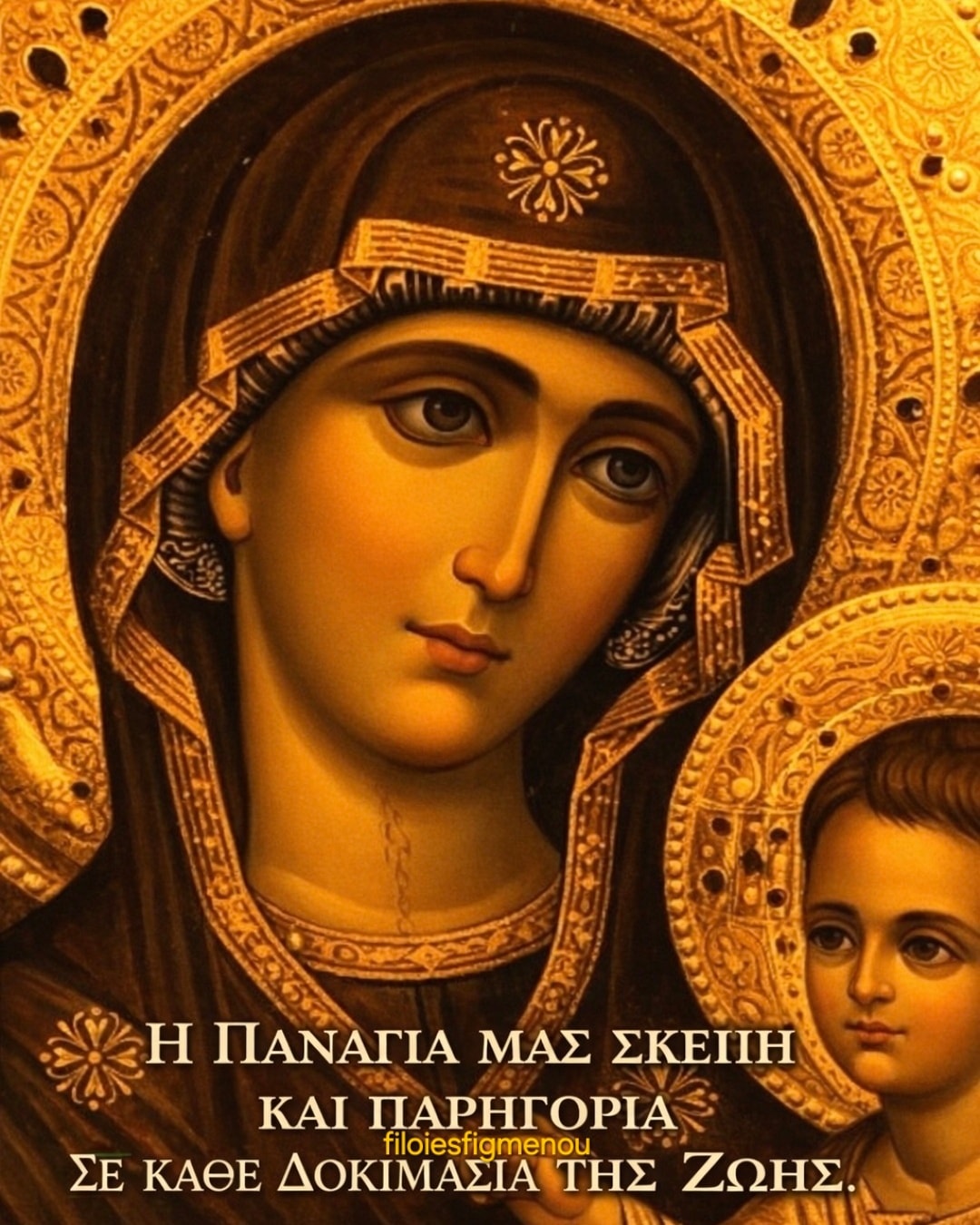 Μη τα δάκρυά μου παρίδης· μη βδελύξη μου τον στεναγμόν· μη απώση μου τον εγκάρδιον πόνον· μη καταισχύνης μου την εις σε προσδοκίαν· αλλά ταις μητρικαίς σου δεήσεσι την του αγαθού Υιού και Θεού σου αβίαστον βιασαμένη ευσπλαγχνίαν, αξίωσόν με τον ταλαίπωρον και ανάξιον δούλόν σου το πρώτον και αρχαίον επαναλαβείν κάλλος της ψυχής, την των παθών αμορφίαν αποβαλείν, ελευθερωθήναι από της αμαρτίας, δουλωθήναι τη δικαιοσύνη, εκδύσασθαι τον μιασμόν της σαρκικής ηδονής, ενδύσασθαι τον αγιασμόν της ψυχικής καθαρότητος, νεκρωθήναι τω κόσμω, ζήσαι τη αρετή· οδοιπορούντί μοι συνοδεύουσα, εν θαλάσση πλέοντι συμπλέουσα, αεί πολεμούντάς με δαίμονας νικώσα, αγρυπνούντά με ενισχύουσα, υπνούντα διαφυλάττουσα, θλιβόμενον παραμυθουμένη, ολιγοψυχούντα παρακαλούσα, ασθενούντα ρωννύουσα, αδικούμενον ρυομένη, συκοφαντούμενον αθωούσα, εις θάνατον κινδυνεύοντα συντόμως προφθάνουσα, φοβερόν με ορατοίς εχθροίς και αοράτοις δεικνύουσα καθ κάστην, ίνα γνώσωσι πάντες οι αδίκως τυραννούντές με δαίμονες τίνος δούλος υπάρχω.