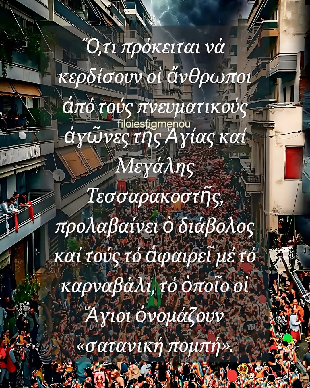 «Κατ’ ἀλήθειαν μπορεῖ νά πεῖ κανείς ὅτι τότε οἱ Χριστιανοί δαιμονίζονται ὅλοι· διότι χορεύουν, παίζουν, τραγουδοῦν ἀσυνειδήτως… τότε, γιά νά πῶ ἔτσι, πανηγυρίζει ἡ ἀσέλγεια· ἑορτάζει ἡ ἀκολασία· εὐφραίνεται ἡ μέθη· ἀγάλλεται ἡ τρυφή καί ἡ ἀσωτεία· χορεύει ὁ διάβολος μέ δέκα μαντήλια καί συγχορεύει μ’ αὐτόν ὅλο τό πλῆθος τῶν δαιμόνων». Ἅγιος Νικόδημος ὁ Ἁγιορείτης