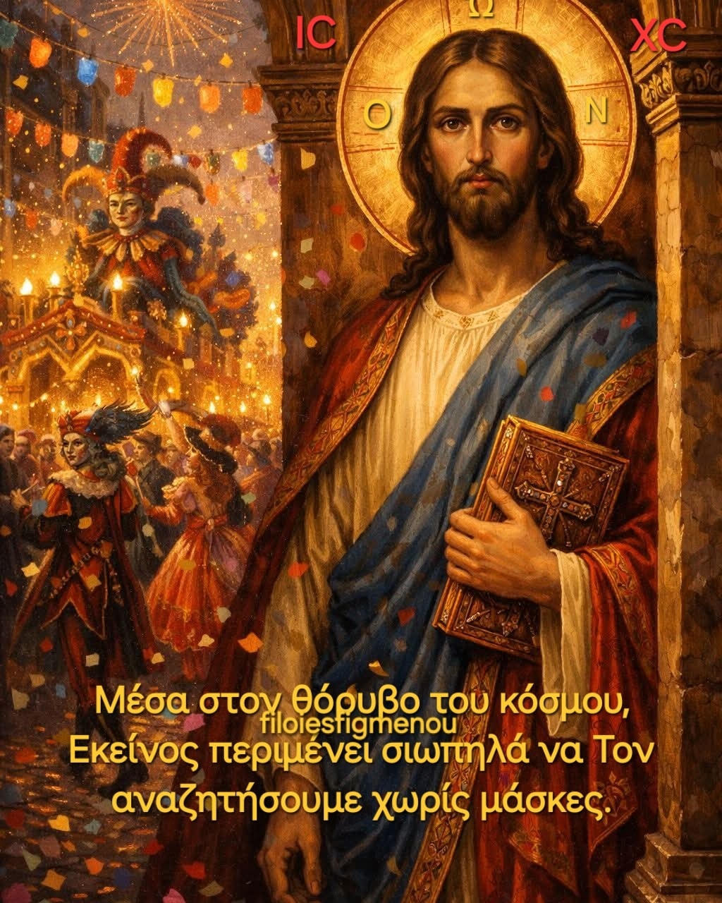 Ο Χριστός δεν διακόπτει ποτέ τη γιορτή μας. Περιμένει υπομονετικά να γίνουμε πάλι πρόσωπα, για να μας χαρίσει τη δική Του, την αιώνια Χαρά. Όταν κουραστούμε από τις στολές και τις επιδείξεις, όταν σταθούμε μόνοι απέναντι στη σιωπή, τότε θα ανακαλύψουμε ότι Εκείνος ήταν πάντοτε παρών, όχι στο κέντρο του θορύβου αλλά στην άκρη του, εκεί όπου γεννιέται η αλήθεια της καρδιάς.