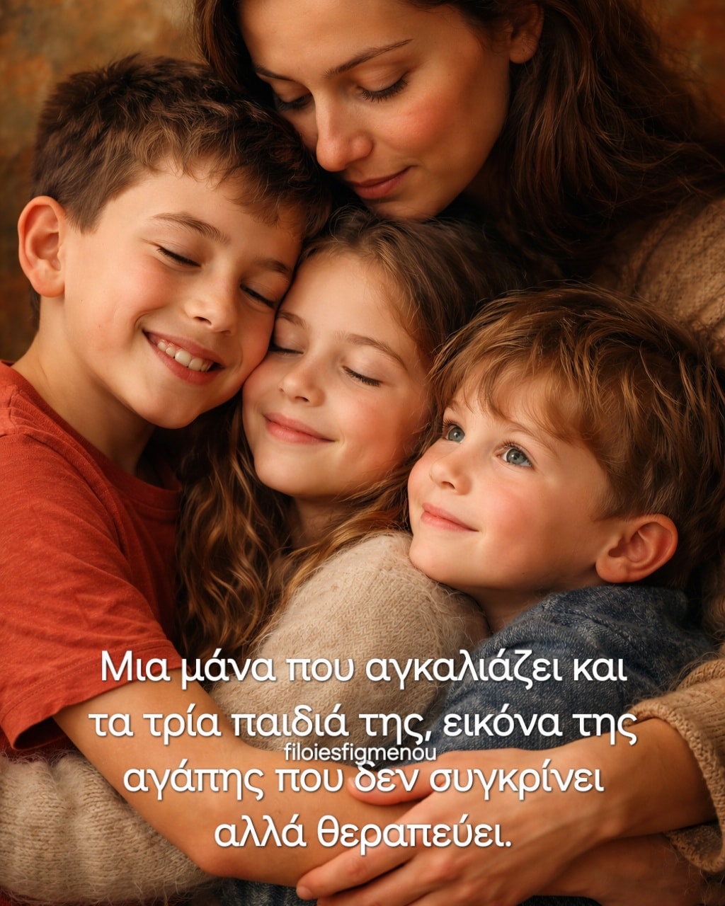 Μια μάνα που αγκαλιάζει και τα τρία παιδιά της, εικόνα της αγάπης που δεν συγκρίνει αλλά θεραπεύει.
