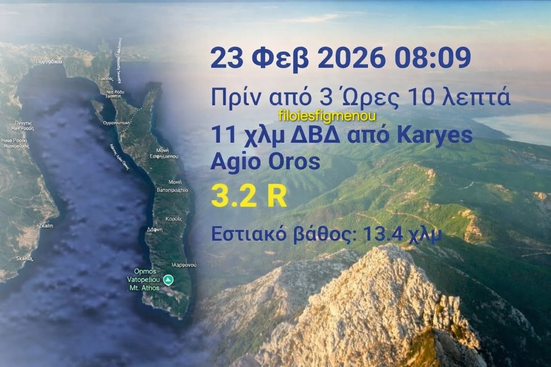 Σεισμική δόνηση μεγέθους 3,2 βαθμών της κλίμακας Ρίχτερ καταγράφηκε το πρωί της 23ης Φεβρουαρίου 2026, στις 08.09, με επίκεντρο θαλάσσια περιοχή νότια του Αγίου Όρους. Σύμφωνα με τα διαθέσιμα στοιχεία, το επίκεντρο εντοπίζεται περίπου 11 χιλιόμετρα δυτικά βορειοδυτικά των Καρυών, με εστιακό βάθος 13,4 χιλιομέτρων, γεγονός που κατατάσσει τη δόνηση στις επιφανειακές.
