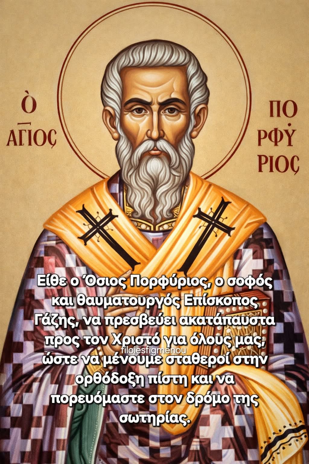 26 Φεβρουαρίου 2026 με το πάτριο ορθόδοξο εορτολόγιο μνήμη του Οσίου Πορφύριου επίσκοπου Γάζης