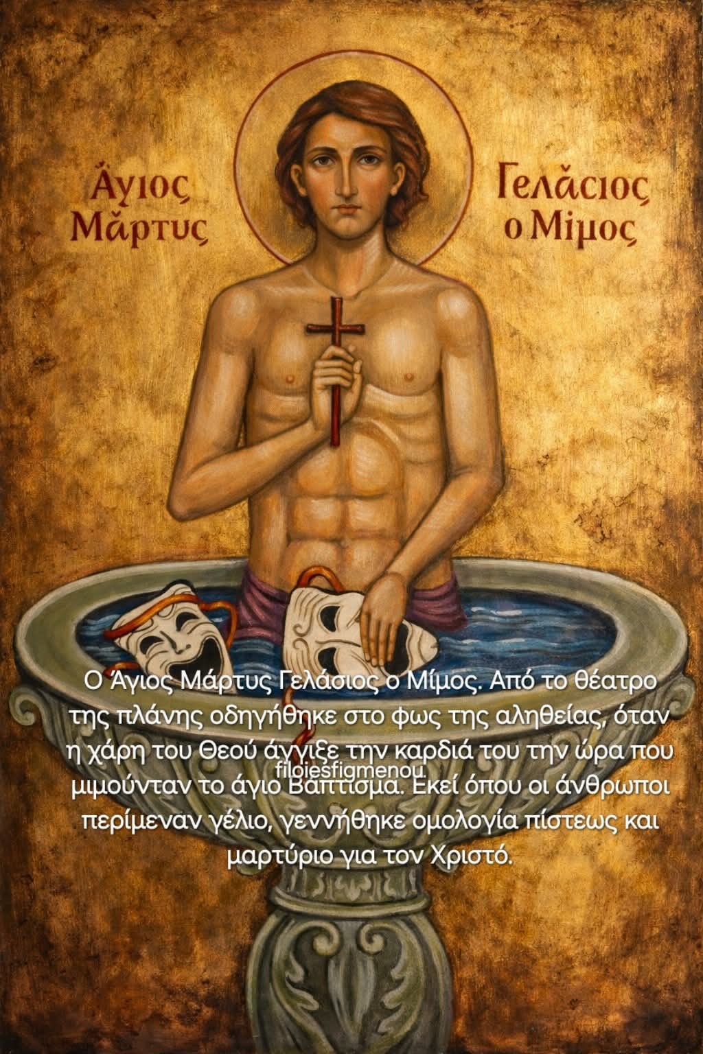 Ο Άγιος Μάρτυς Γελάσιος ο Μίμος. Από το θέατρο της πλάνης οδηγήθηκε στο φως της αληθείας, όταν η χάρη του Θεού άγγιξε την καρδιά του την ώρα που μιμούνταν το άγιο Βάπτισμα. Εκεί όπου οι άνθρωποι περίμεναν γέλιο, γεννήθηκε ομολογία πίστεως και μαρτύριο για τον Χριστό.