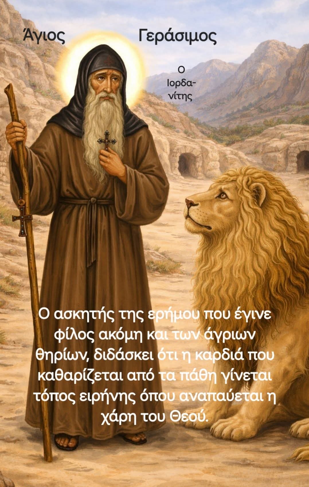 Ο ασκητής της ερήμου που έγινε φίλος ακόμη και των άγριων θηρίων, διδάσκει ότι η καρδιά που καθαρίζεται από τα πάθη γίνεται τόπος ειρήνης όπου αναπαύεται η χάρη του Θεού.