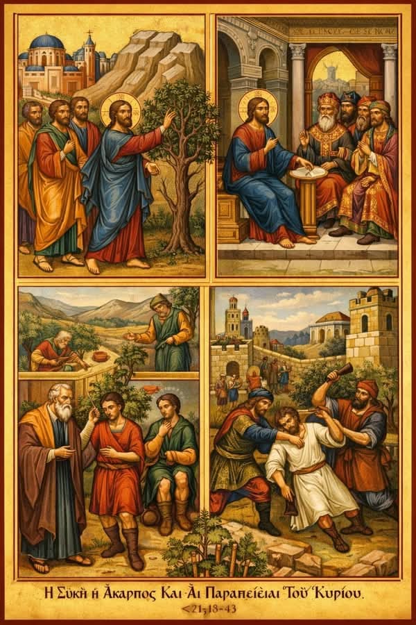 Τῷ καιρῷ ἐἘκ τοῦ κατὰ Ματθαῖον ἁγίου Εὐαγγελίου το ἀνάγνωσμα.κείνῳ, ἐπανάγων ὁ ᾿Ιησοῦς εἰς τὴν πόλιν, ἐπείνασε· καὶ ἰδὼν συκῆν μίαν ἐπὶ τῆς ὁδοῦ, ἦλθεν ἐπ᾿ αὐτήν, καὶ οὐδὲν εὗρεν ἐν αὐτῇ, εἰ μὴ φύλλα μόνον, καὶ λέγει αὐτῇ· Μηκέτι ἐκ σοῦ καρπὸς γένηται εἰς τὸν αἰῶνα. Καὶ ἐξηράνθη παραχρῆμα ἡ συκῆ. Καὶ ἰδόντες οἱ Μαθηταὶ, ἐθαύμασαν λέγοντες· πῶς παραχρῆμα ἐξηράνθη ἡ συκῆ; Ἀποκριθεὶς δὲ ὁ ᾿Ιησοῦς, εἶπεν αὐτοῖς· ἀμὴν λέγω ὑμῖν, ἐὰν ἔχητε πίστιν, καὶ μὴ διακριθῆτε, οὐ μόνον τὸ τῆς συκῆς ποιήσετε, ἀλλὰ κἂν τῷ ὄρει τούτῳ εἴπητε· ἄρθητι, καὶ βλήθητι εἰς τὴν θάλασσαν, γενήσεται· καὶ πάντα ὅσα ἐὰν αἰτήσητε ἐν τῇ προσευχῇ, πιστεύοντες, λήψεσθε. Καὶ ἐλθόντι αὐτῷ εἰς τὸ ἱερὸν, προσῆλθον αὐτῷ διδάσκοντι οἱ Ἀρχιερεῖς καὶ οἱ Πρεσβύτεροι τοῦ λαοῦ, λέγοντες· Ἐν ποίᾳ ἐξουσίᾳ ταῦτα ποιεῖς, καὶ τίς σοι ἔδωκε τὴν ἐξουσίαν ταύτην; Ἀποκριθεὶς δὲ ὁ ᾿Ιησοῦς, εἶπεν αὐτοῖς· Ἐρωτήσω ὑμᾶς κἀγὼ λόγον ἕνα, ὃν ἐὰν εἴπητέ μοι, κἀγὼ ὑμῖν ἐρῶ, ἐν ποίᾳ ἐξουσίᾳ ταῦτα ποιῶ. Τὸ βάπτισμα ᾿Ιωάννου πόθεν ἦν, ἐξ οὐρανοῦ, ἢ ἐξ ἀνθρώπων; Οἱ δὲ διελογίζοντο παρ᾿ ἑαυτοῖς, λέγοντες· Ἐὰν εἴπωμεν, ἐξ οὐρανοῦ, ἐρεῖ ὴμῖν· Διατί οὖν οὐκ ἐπιστεύσατε αὐτῷ; ἐὰν δὲ εἴπωμεν, ἐξ ἀνθρώπων· φοβούμεθα τὸν ὄχλον· πάντες γὰρ ἔχουσι τὸν ᾿Ιωάννην ὡς προφήτην. Καὶ ἀποκριθέντες τῷ ᾿Ιησοῦ εἶπον· Οὐκ οἴδαμεν. Ἔφη αὐτοῖς καὶ αὐτός· Οὐδὲ ἐγὼ λέγω ὑμῖν, ἐν ποίᾳ ἐξουσίᾳ ταῦτα ποιῶ. Τί δὲ ὑμῖν δοκεῖ; Ἄνθρωπός τις εἶχε τέκνα δύο, καὶ προσελθὼν τῷ πρώτῳ, εἶπε· Τέκνον, ὕπαγε σήμερον ἐργάζου ἐν τῷ ἀμπελῶνί μου. Ὁ δὲ ἀποκριθεὶς, εἶπεν· Οὐ θέλω· ὕστερον δὲ μεταμεληθεὶς, ἀπῆλθε. Καὶ προσελθὼν τῷ δευτέρῳ, εἶπεν ὡσαύτως. Ὁ δὲ ἀποκριθεὶς, εἶπεν· Ἐγώ, κύριε· καὶ οὐκ ἀπῆλθε. Τίς ἐκ τῶν δύο ἐποίησε τὸ θέλημα τοῦ πατρός; Λέγουσιν αὐτῷ· Ὁ πρῶτος. Λέγει αὐτοῖς ὁ ᾿Ιησοῦς· Ἀμὴν λέγω ὑμῖν, ὅτι οἱ τελῶναι καὶ αἱ πόρναι προάγουσιν ὑμᾶς εἰς τὴν βασιλείαν τοῦ Θεοῦ. Ἦλθε γὰρ πρὸς ὑμᾶς ᾿Ιωάννης ἐν ὁδῷ δικαιοσύνης, καὶ οὐκ ἐπιστεύσατε αὐτῷ· οἱ δὲ τελῶναι καὶ αἱ πόρναι ἐπίστευσαν αὐτῷ· ὑμεῖς δὲ ἰδόντες, οὐ μετεμελήθητε ὕστερον, τοῦ πιστεῦσαι αὐτῷ. ῎Αλλην παραβολὴν ἀκούσατε· Ἄνθρωπός τις ἦν οἰκοδεσπότης, ὅστις ἐφύτευσεν ἀμπελῶνα καὶ φραγμὸν αὐτῷ περιέθηκε, καὶ ὤρυξεν ἐν αὐτῷ ληνὸν, καὶ ᾠκοδόμησε πύργον, καὶ ἐξέδοτο αὐτὸν γεωργοῖς, καὶ ἀπεδήμησεν. Ὅτε δὲ ἤγγισεν ὁ καιρὸς τῶν καρπῶν, ἀπέστειλε τοὺς δούλους αὐτοῦ πρὸς τοὺς γεωργοὺς, λαβεῖν τοὺς καρποὺς αὐτοῦ. Καὶ λαβόντες οἱ γεωργοὶ τοὺς δούλους αὐτοῦ, ὃν μὲν ἔδειραν, ὃν δὲ ἀπέκτειναν, ὃν δὲ ἐλιθοβόλησαν. Πάλιν ἀπέστειλεν ἄλλους δούλους πλείονας τῶν πρώτων, καὶ ἐποίησαν αὐτοῖς ὡσαύτως. Ὕστερον δὲ ἀπέστειλε πρὸς αὐτοὺς τὸν υἱὸν αὐτοῦ, λέγων· Ἐντραπήσονται τὸν υἱόν μου. Οἱ δὲ γεωργοὶ, ἰδόντες τὸν υἱὸν, εἶπον ἐν ἑαυτοῖς· Οὗτός ἐστιν ὁ κληρονόμος· δεῦτε, ἀποκτείνωμεν αὐτὸν, καὶ κατάσχωμεν τὴν κληρονομίαν αὐτοῦ. Καὶ λαβόντες αὐτὸν, ἐξέβαλον ἔξω τοῦ ἀμπελῶνος, καὶ ἀπέκτεινον. Ὅταν οὖν ἔλθῃ ὁ κύριος τοῦ ἀμπελῶνος, τί ποιήσει τοῖς γεωργοῖς ἐκείνοις; Λέγουσιν αὐτῷ· Κακοὺς κακῶς ἀπολέσει αὐτούς, καὶ τὸν ἀμπελῶνα ἐκδώσεται ἄλλοις γεωργοῖς, οἵτινες ἀποδώσουσιν αὐτῷ τοὺς καρποὺς ἐν τοῖς καιροῖς αὐτῶν. Λέγει αὐτοῖς ὁ ᾿Ιησοῦς· Οὐδέποτε ἀνέγνωτε ἐν ταῖς Γρ